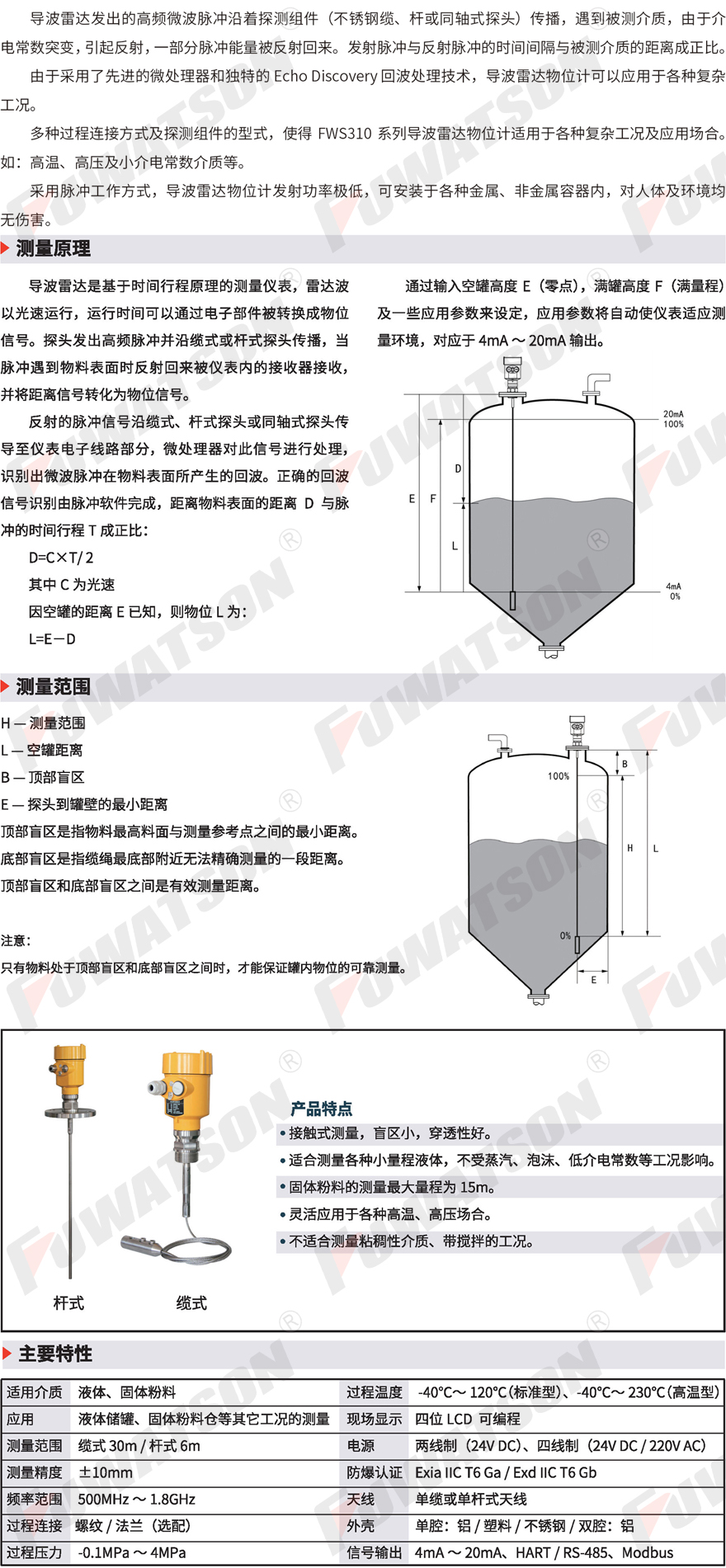 多种过程连接方式及探测组件的型式,使得 FWS310 系列导波雷达物位计适用于各种复杂工况及应用场合。如:高温、高压及小介电常数介质等。...