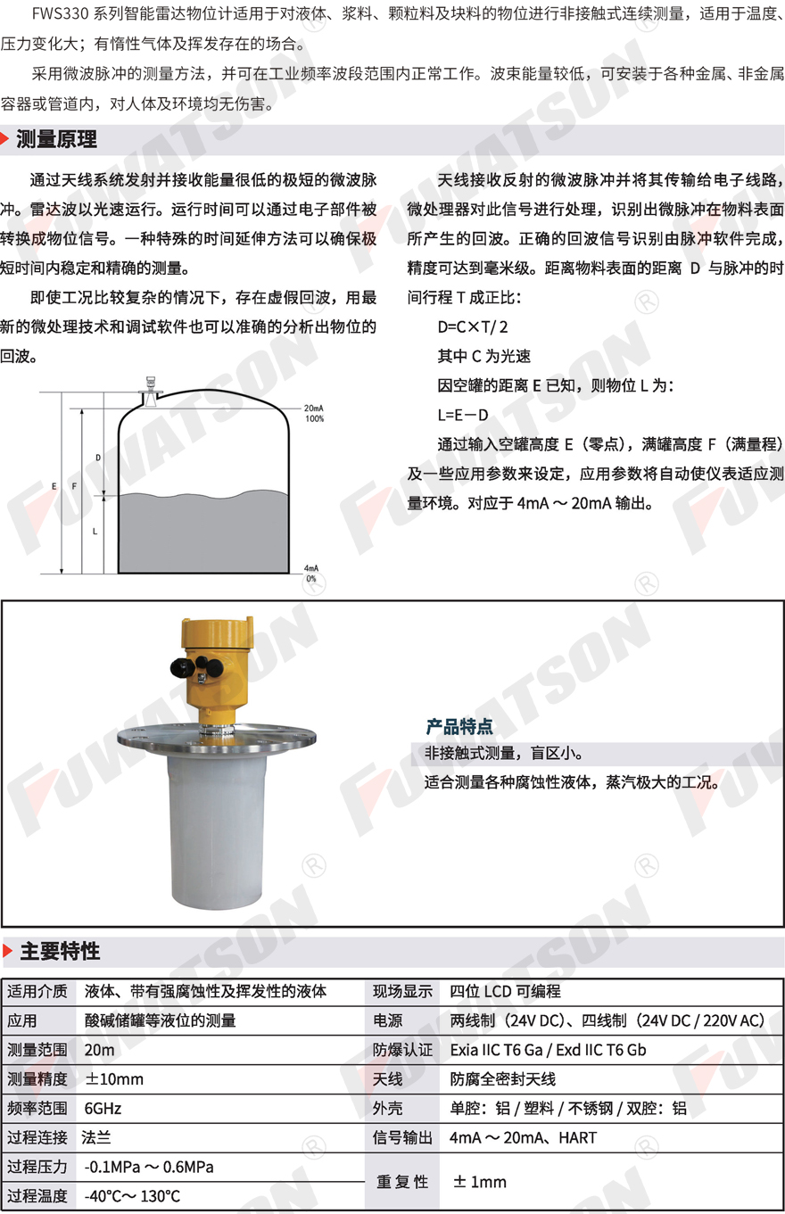 FWS330系列智能雷达物位计适用于对液体、浆料、颗粒料及块料的物位进行非接触式连续测量,适用于温度、压力变化大;有惰性气体及挥发存在的场合。...